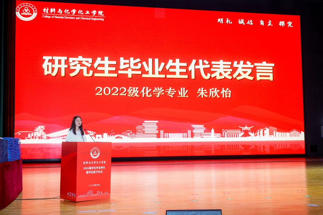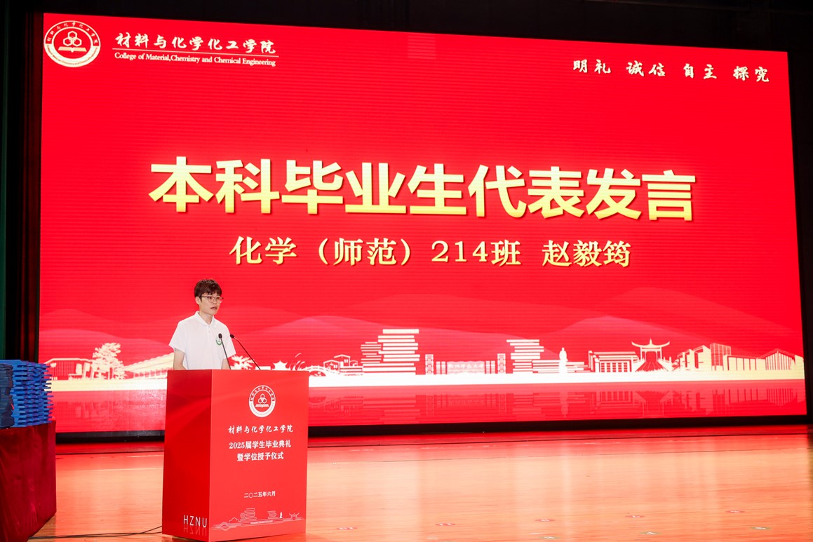 研究生毕业生代表、2022级化学专业朱欣怡,本科毕业生代表、化学(师范)214班赵毅筠分别上台发言。他们深情回顾在大师兄影视 的求学时光,感恩师长的悉心教导、同学的真挚情谊;展望未来,立志以昂扬的姿态,在更广阔的天地中践行材化人的使命与担当,让青春在不懈奋斗中绽放绚丽之花。