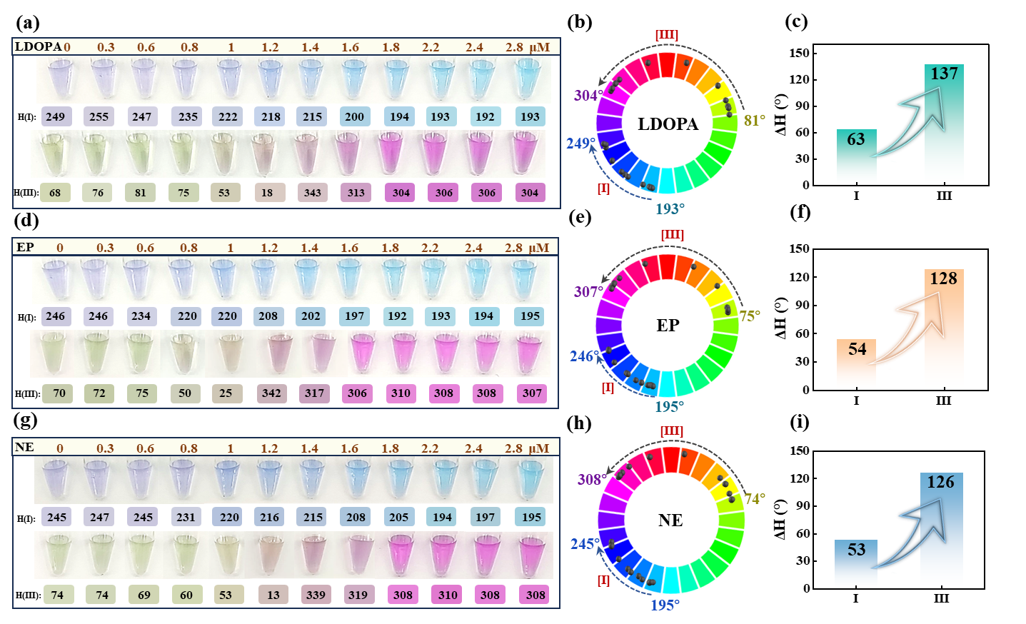 图3. 高分辨率色相传感对不同儿茶酚胺类的检测普适性
