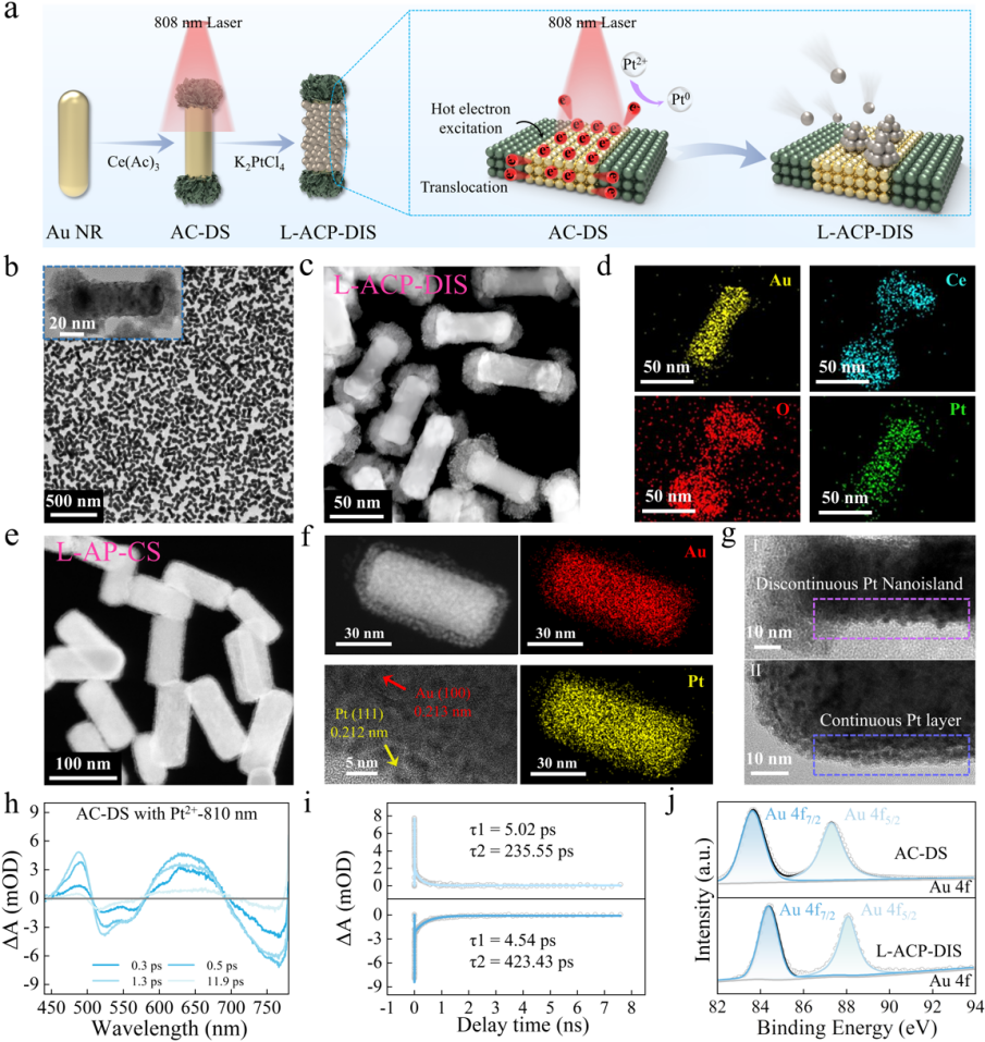 传统纳米酶较高的Km值意味着其对H₂O₂的“捕捉能力”较弱,易受复杂生物基质(如尿液、血液)中干扰物质影响,在面对临床样本中微量H₂O₂时“力不从心”,从而导致诊断结果偏差。如何通过精准设计提升纳米酶对H₂O₂的亲和力,成为科研人员亟待突破的核心目标。研究团队针对传统纳米酶对H₂O₂亲和力低这一长期难题展开系统攻关。摒弃以往单一结构优化的传统策略,通过热电子转移驱动元素掺杂、结构调控、表面工程的协同整合,实现元素间电子高效传递、高密度表面缺陷以及d带中心的精准调控,成功构建了可高效捕捉H2O2的Au NR@CeO₂@Pt(L-ACP-DIS)纳米酶探针。激光诱导的耦合作用与电子转移过程在Au NR@CeO₂基底的活化中发挥关键作用。金纳米棒(AuNR)可作为“电子激发器”,利用其局域表面等离激元特性可在近红外光激发下产生大量热电子,显著降低表面化学反应能垒,促进快速氧化还原反应的发生。因此,通过激光介导的热电子激发实现Pt2+还原沉积生长所形成的异质结构具有丰富的表面缺陷。半导体二氧化铈(CeO2)凭借其“电子泵”功能,不仅为热电子迁移提供高效通道,还能有效延缓Au NR表面的热电子激发速率。在此基础上,CeO2可进一步精准调控Pt²⁺的还原动力学行为,从而实现Pt²⁺的非均匀还原沉积,这一过程突破了传统Pt连续性生长模式的局限,促使其生长模式转变为非连续、高比表面积的Pt纳米岛结构。这种创新性设计使L-ACP-DIS纳米酶具备高暴露的催化活性位点数量、高表面缺陷密度以及高d带中心特性,从而展现出卓越的H₂O₂亲和性,其Km低至0.1907 mM,较近年来多数已报道的纳米酶探针材料提高1-3个数量级。
