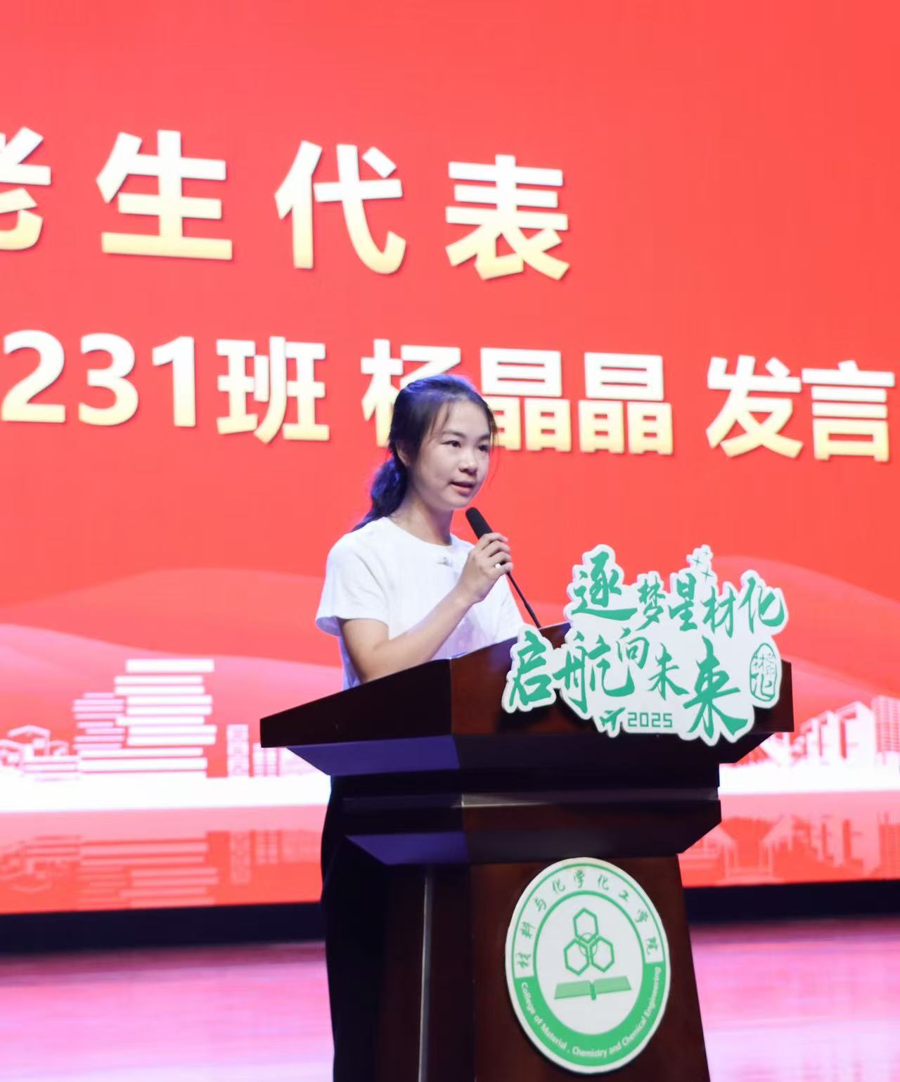 在下沙校区艺术中心1200座隆重举行学院党委书记来国灿,副院长李志芳、黄又举,学院党委副书记管庆江,教授代表章鹏飞,院长助理、化学系主任邵欣欣,院长助理、化工系主任汤龙程,高分子系副主任叶丽军,2025级新生班主任团队,全体辅导员与每一位满怀憧憬与期待的材化萌新们共同奔赴这场启迪梦想、绽放青春的盛会。开学第一课由管庆江主持。