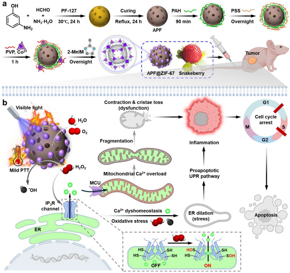 近日,我校大师兄影视 祝鼎成副教授与刘俊秋教授团队在光催化抗肿瘤研究领域取得新进展,相关研究成果以题为A Snakeberry-Inspired Photocatalytic Nanoreactor Activates Endogenous Ca2+ Store for Ca2+ Overload-Mediated Cancer Therapy发表于国际知名期刊Small上(IF = 12.1)。 该工作利用仿蛇莓状多层结构纳米反应器,通过可见光催化级联生成H2O2/·OH,特异性激活IP3R钙通道诱导线粒体钙超载,实现精准高效的肿瘤清除。