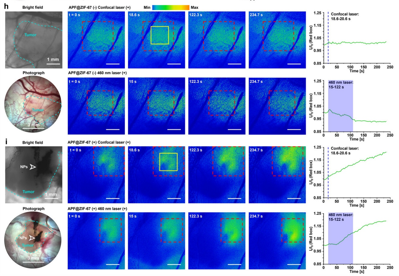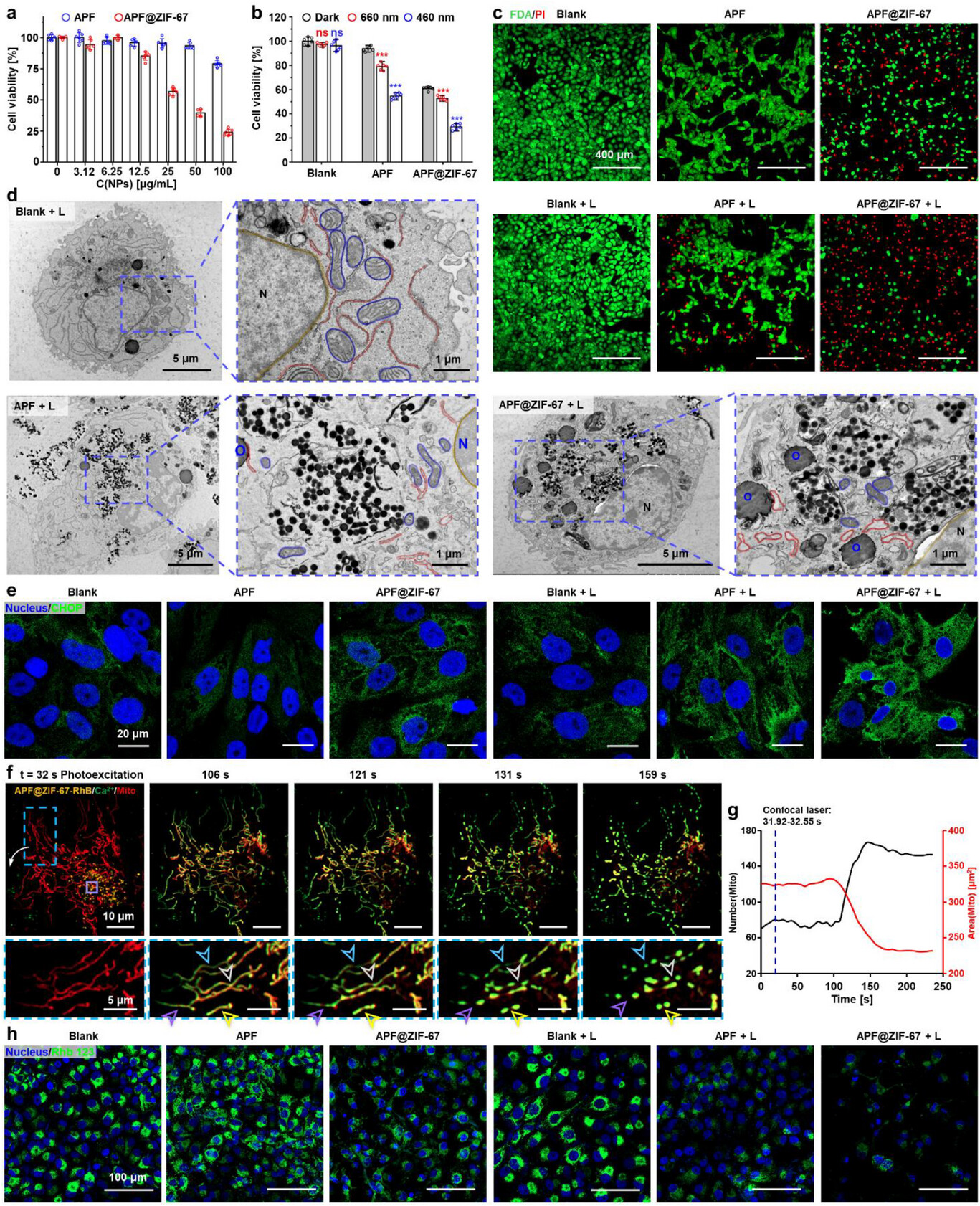 在可见光照射下,光催化H2O2通过氧化半胱氨酸残基而激活IP3R通道,触发内质网Ca2+释放;线粒体钙单向转运体(MCU)介导Ca2+涌入引发线粒体钙超载导致结构崩溃。钙稳态失调与氧化应激协同激活内质网应激及未折叠蛋白反应(UPR),持续损伤诱发炎症级联反应,最终导向炎症介导的衰老与凋亡。同时,肿瘤细胞之间的线粒体转移受损会诱导旁观者效应并放大治疗作用。(图1B)
