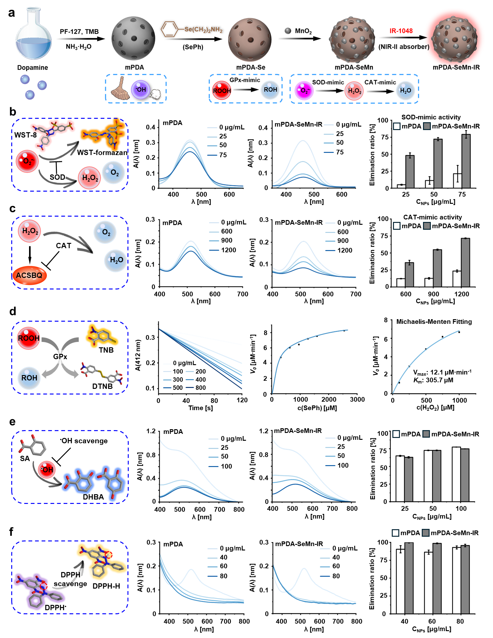 图1. mPDA-SeMn-IR纳米颗粒的结构设计示意及其各组分(mPDA、SePh、MnO2)对多种活性氧(ROS)的级联清除能力。