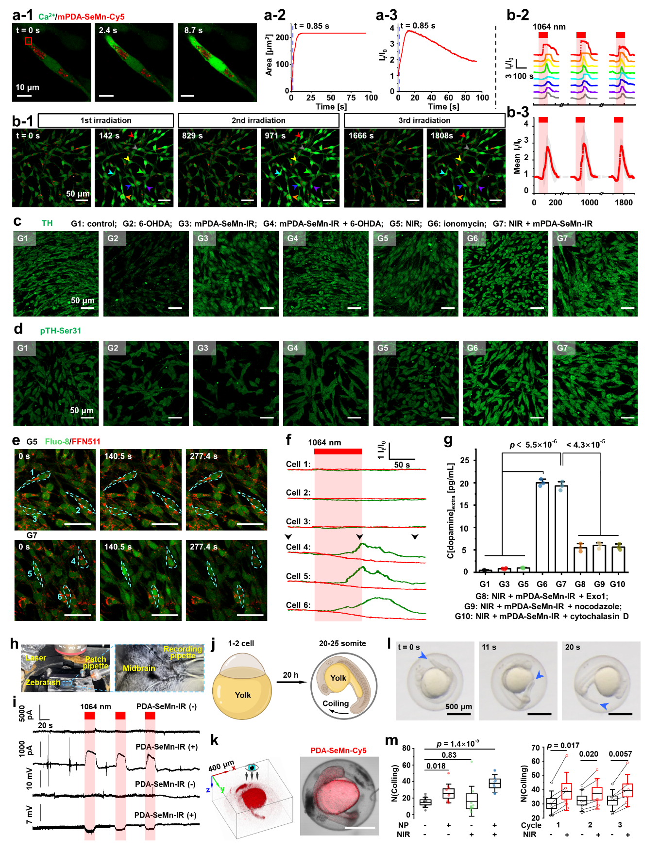 在 6‑羟基多巴胺(6‑OHDA)诱导的体外帕金森模型中,mPDA-SeMn-IR能显著降低细胞毒性,维持神经元形态,避免α‑Syn 异常聚集,保护线粒体功能并阻断细胞色素 c 释放与 Caspase‑3/7 激活,显著抑制神经凋亡。随后,在 NIR‑II(1064 nm)光照下,温和光热效应可快速激活内质网肌醇三磷酸受体(IP3R),并可重复地控制内质网 Ca2+ 释放(图2a,b)。Ca2+信号激活下游信号通路,上调多巴胺合成限速酶酪氨酸羟化酶(TH)的表达及磷酸化水平(图2c,d),促进多巴胺合成;同时,Ca2+信号还能促进多巴胺囊泡的胞外释放,两者协同提升胞外多巴胺浓度(图2e-g)。