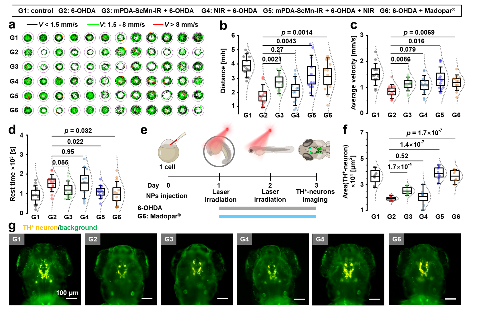 图3. 在斑马鱼帕金森模型中,多酶级联抗氧化与深部脑刺激协同作用显著改善运动行为,并有效保护中脑多巴胺能神经元。