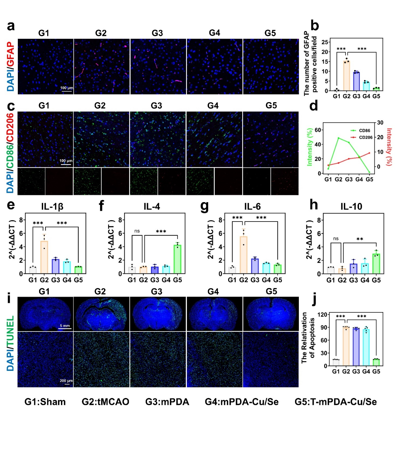 图4. T-mPDA-Cu/Se纳米酶的神经炎症抑制和抗细胞凋亡作用。